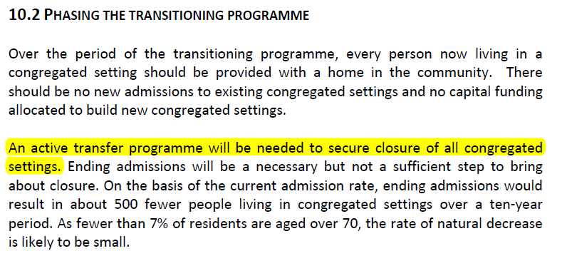 - An active transfer programme will be needed to secure closure of all congregated settings. Ending admissions will be a necessary but not a sufficient step to bring about closure. (See 10.2 p.192)