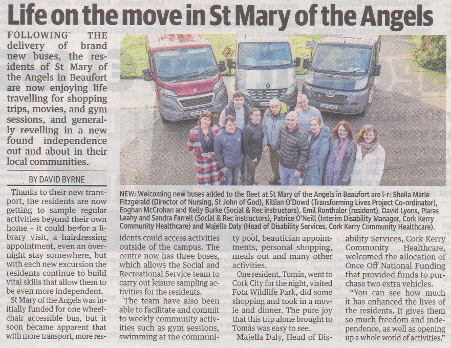 - Killarney Advertiser: New buses driving community living for St Mary of the Angels residents, 13th February 2023