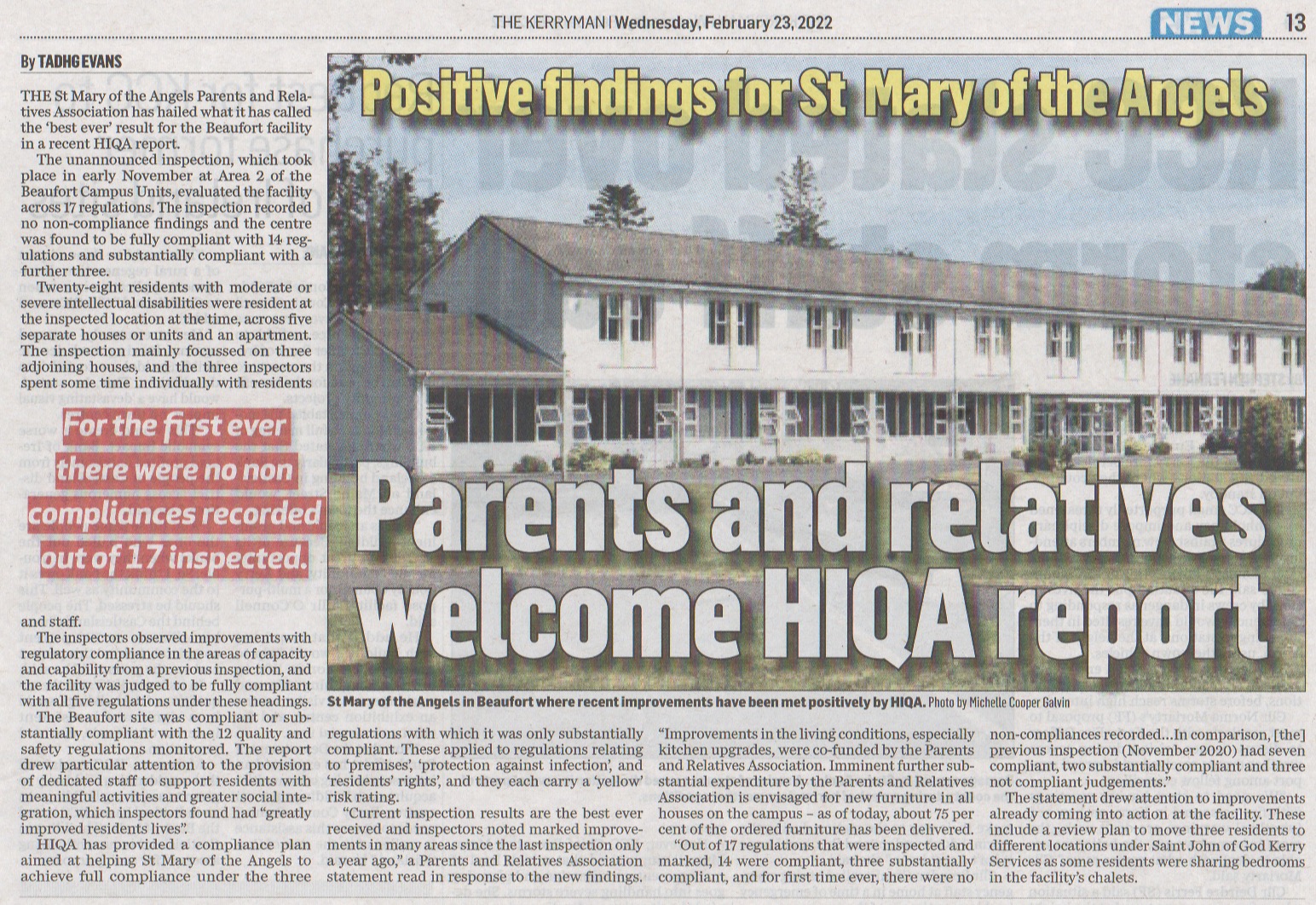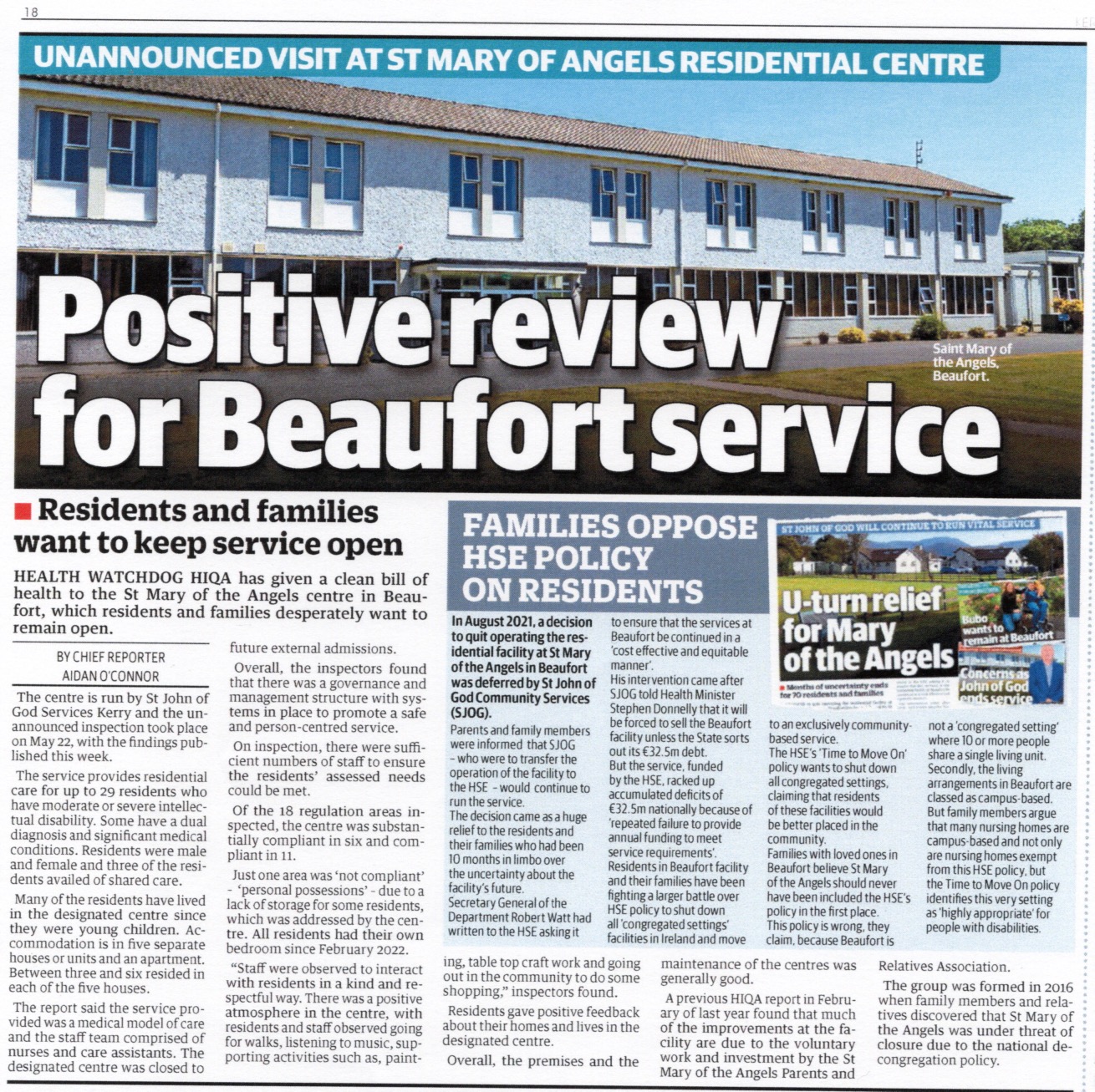 - Killarney Advertiser: HIQA report praises Beaufort care facility, 22nd February 2022