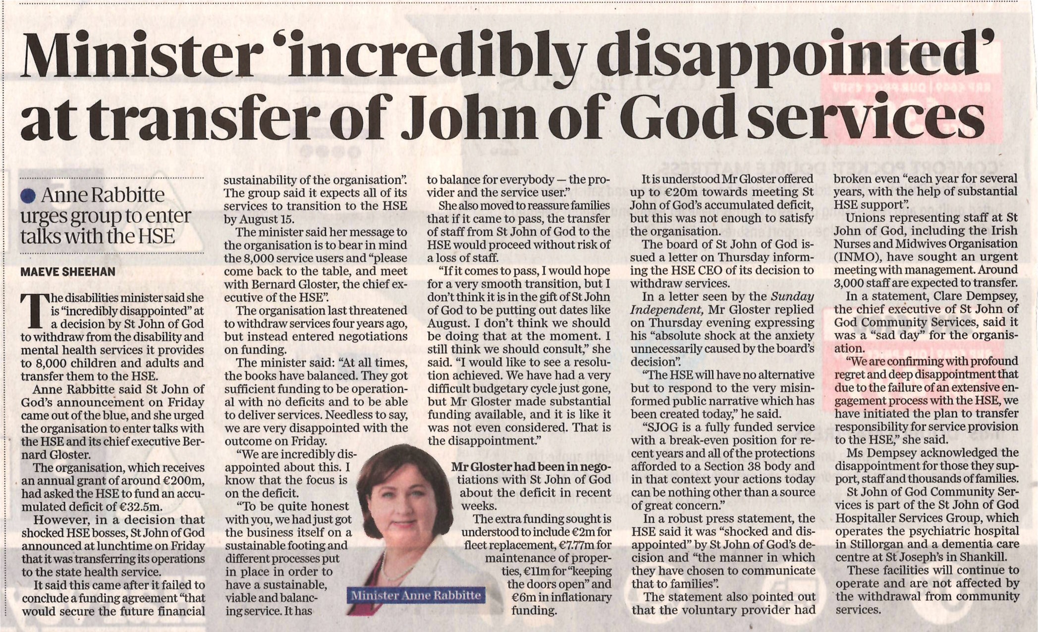 - Irish Independent: Anne Rabbitte says funding crisis at St John of God Community Services causing ‘anxiety’ for families as HSE fails to reach agreement, 19th February 2024
