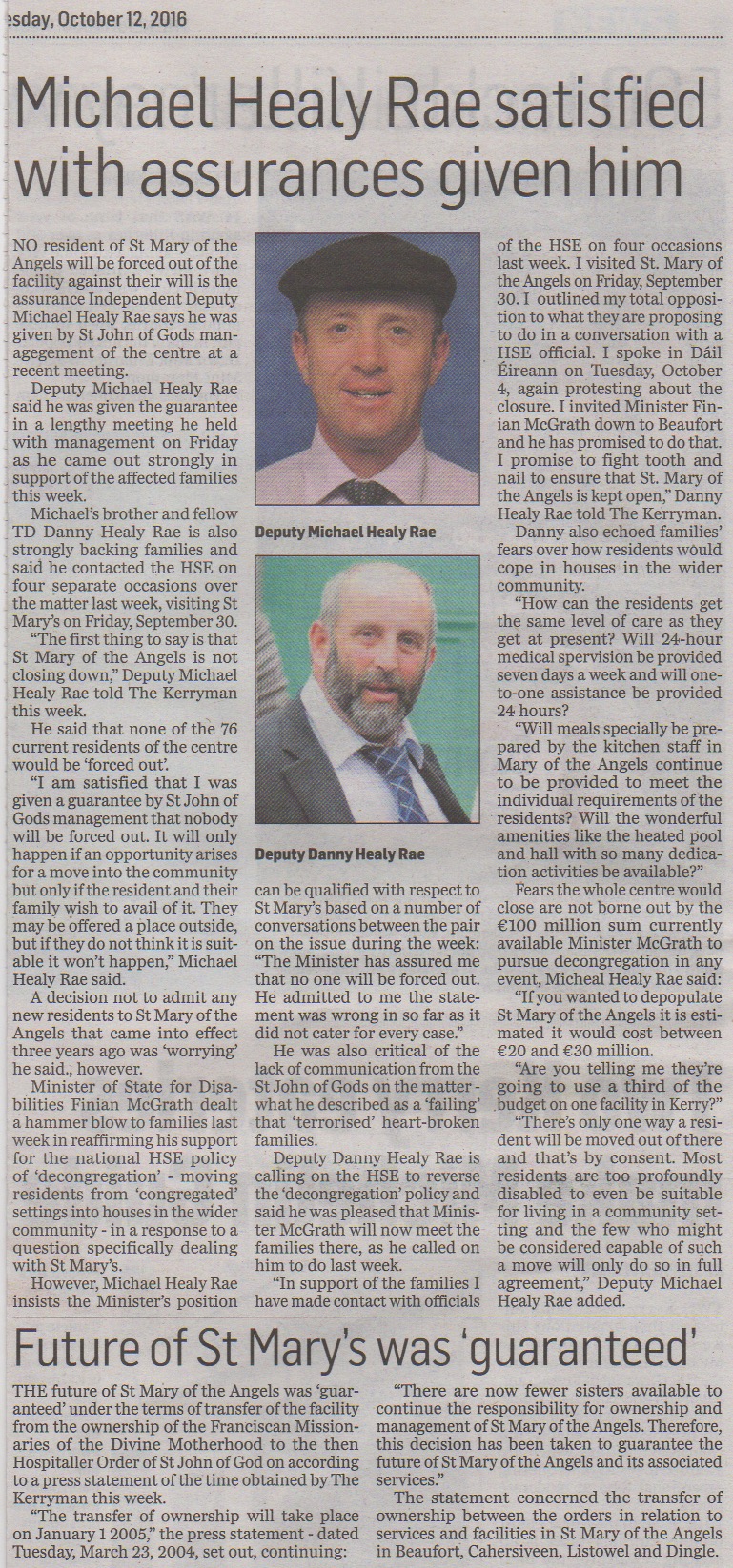 - Radio Kerry News: Minister gives assurances to St Mary of the Angels’ residents and families, 19th October 2016