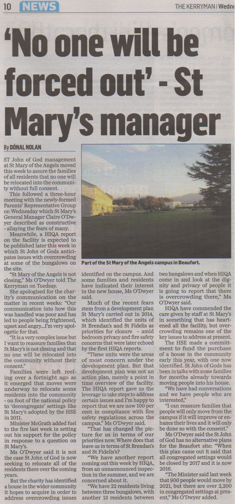 - The Kerryman: HSE has 'agreed' new relocation criteria with St Mary's families, 16th November 2016