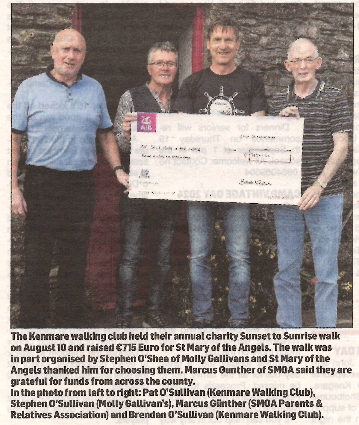 - The Kerryman: Charities gather to celebrate as cycle raises seven-figure sum again (St Mary of the Angels' share is close to €80,000), 26th September 2018
